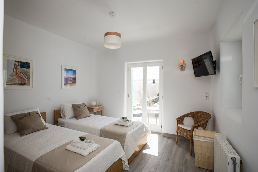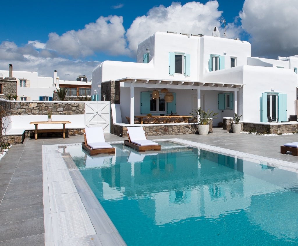 The main floor consists of a large living area featuring a natural stone wall leading to an open concept kitchen and dining area. The additional 2 bedrooms are also located on the main level. The villa features whitewashed walls and architectural arches that maintain the traditional Mykonian style.