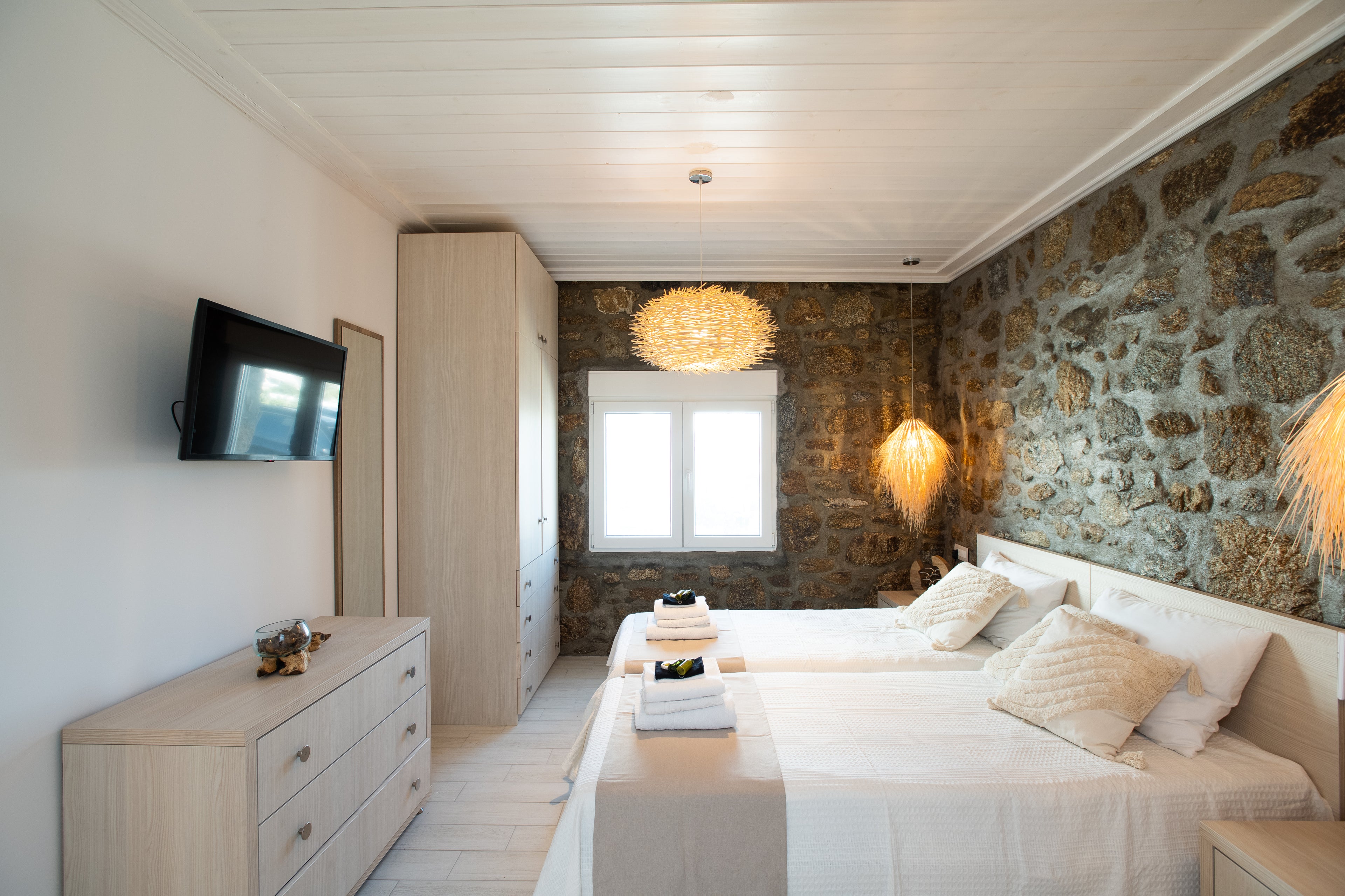 Villa Platinum, a stunning combination of natural stone and whitewashed walls is reflective of the traditional island style. This well appointed villa with high end furnishings for guests to relax and enjoy their stay. Attention to details, function and style come together to offer guests all the conveniences while upholding the Mykonian island vibe.