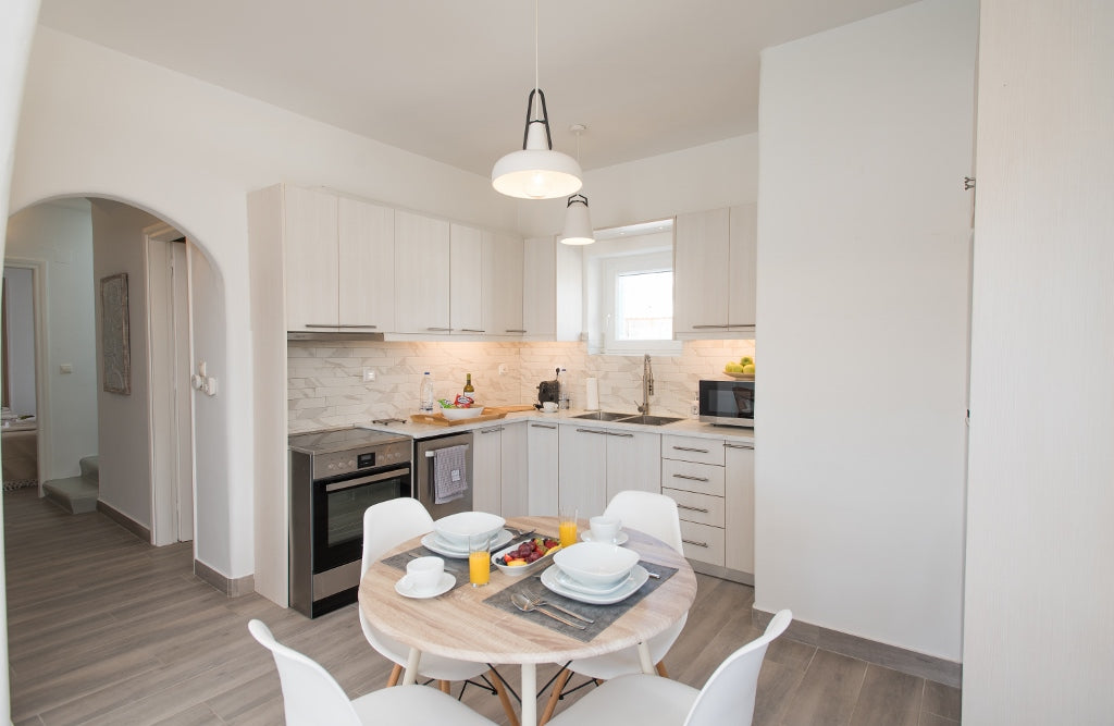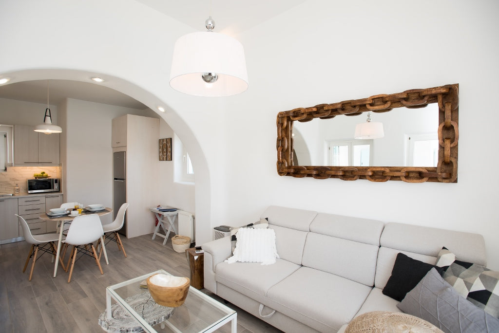 The contemporary indoor areas of the villa are designed for comfort and relaxation while maintaining a traditional Mykonian vibe.